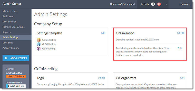 - Admins can click Set up to begin creating a new organization by verifying 1 or more email domains. If an organization has already been created, the admin can click Edit to manage their email domains, Identity Provider, and organization users in the Organization Center. Previously, admins had to manually navigate to https://organization.logmeininc.com to access the Organization Center and manage these settings. (EXTERNALADMIN-2513)