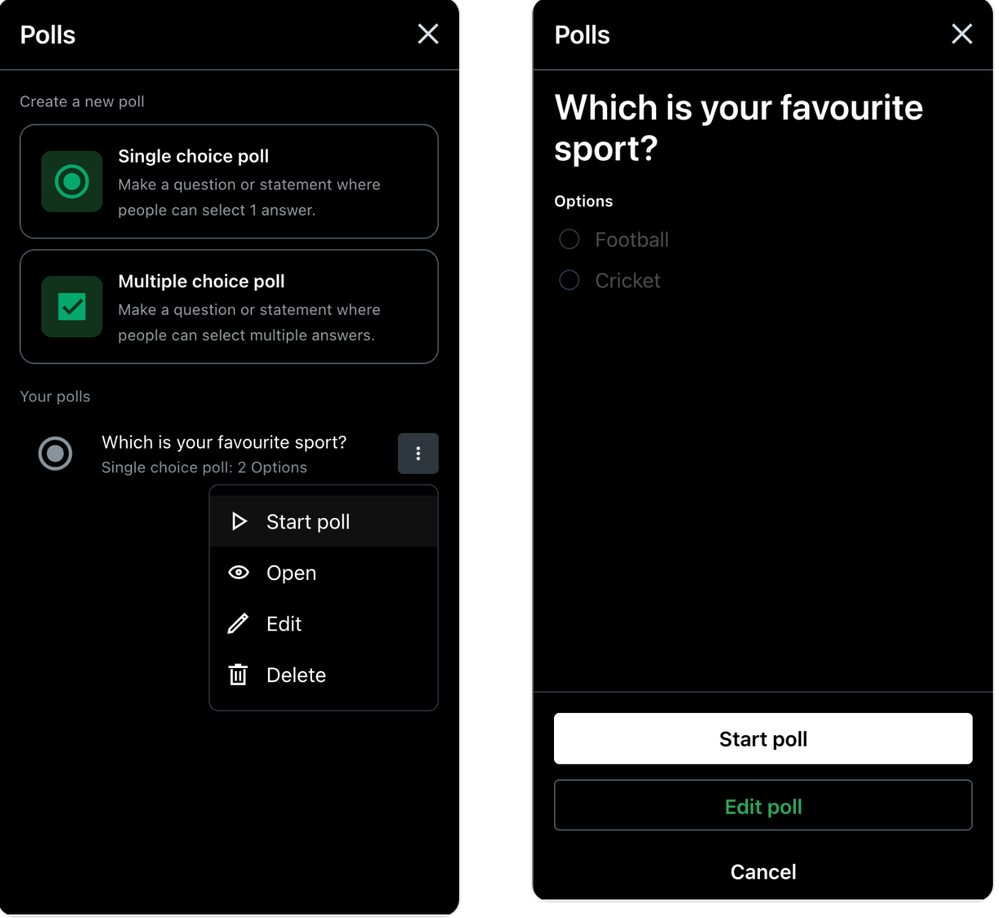 - Poll can be launched and edited by clicking on the created Poll or from the 3-dot menu