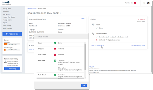 - Admins that manage GoToRoom systems can now oversee the health status of their systems and devices connections, so they can be informed when to take action when needed. Health monitoring includes information about whether the systems are online or offline, and whether device connections are connected or not found. Admins can also see if a device is currently in use on the Room Details page. (EXTERNALADMIN-2730)