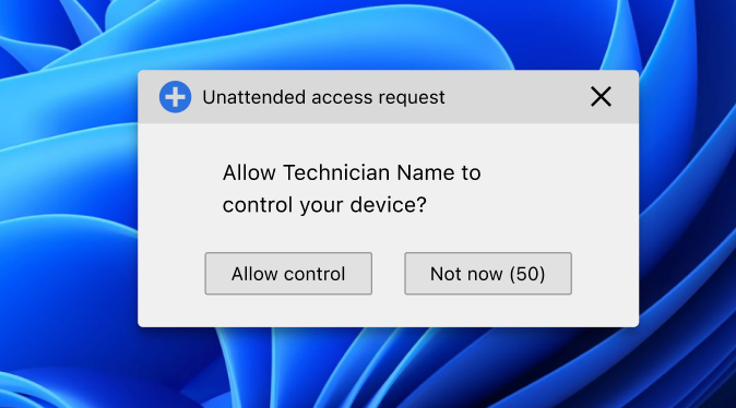 The permission prompt ensures that the end-user's privacy is protected, they remain in control of their data, and they understand why the Unattended Device is requesting access, building trust and transparency. Please note: If no end-user is logged into the Unattended Device, the session proceeds as normal.
