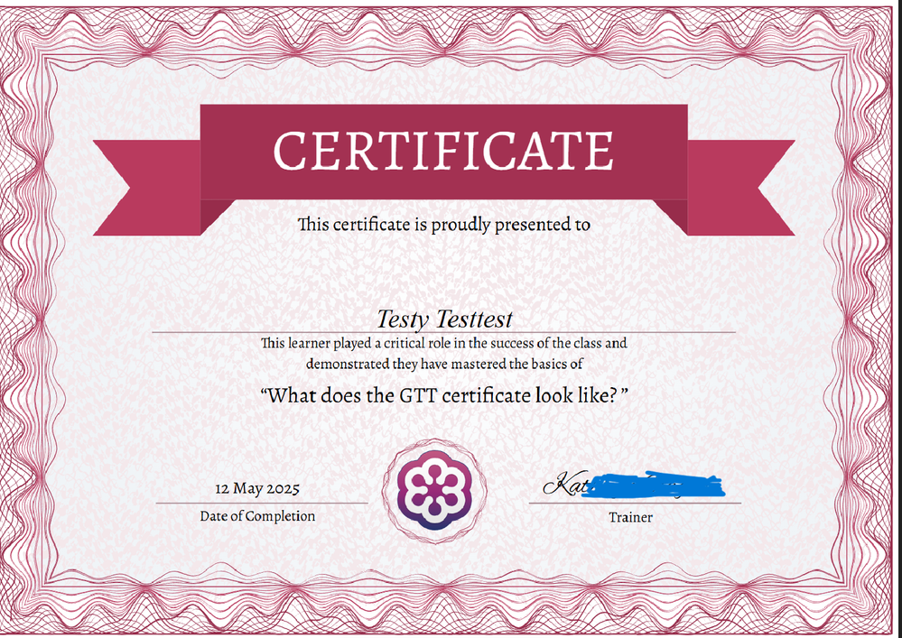- The Certificate itself will be sent with the title of the Training, the date, and 'signed' by the trainer, it looks like this: