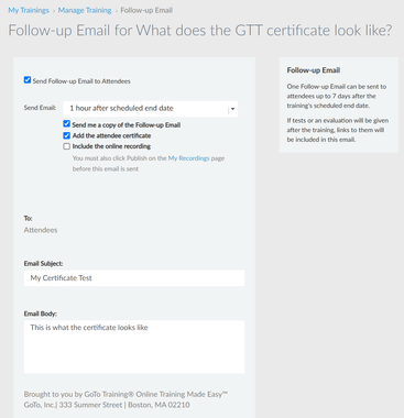 - You can edit the email sent to attendees under My Trainings, Manage Training, Certificate