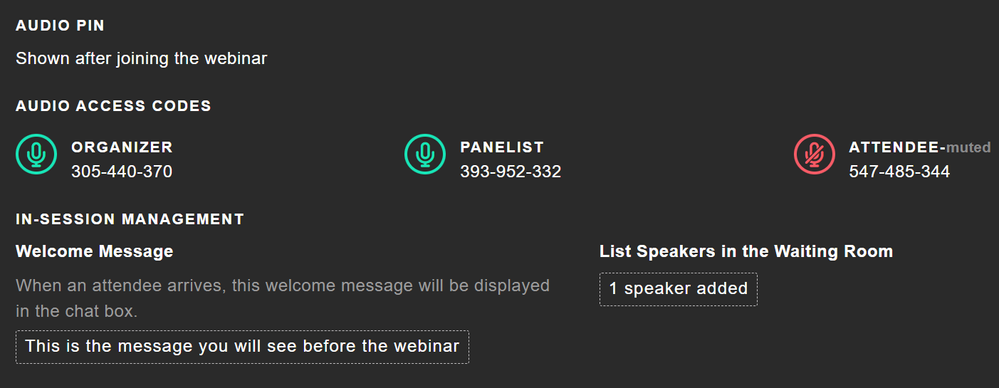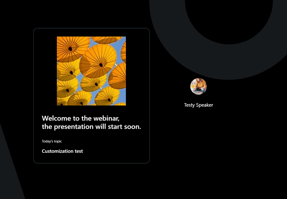 I see from your registration page that you have added branding images, which will be shown in the waiting room. If you want to add speakers, you can do this in the Event Details page and then under settings: