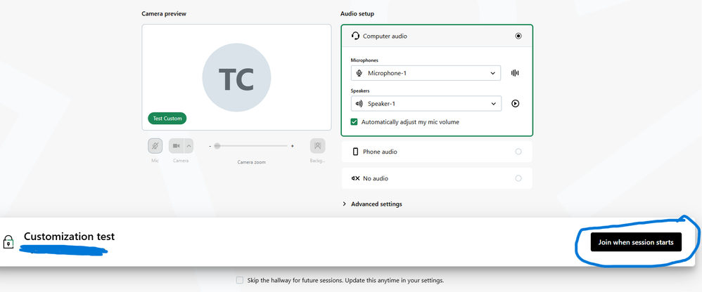 Prior to start of the webinar, usually when the organizer's are in pre-broadcast mode, attendees are taken to the Hallway, which can not be customized. They are given the option to test their audio, and then join when session starts:
