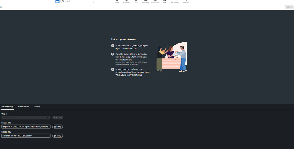 Then i turned my attention to a Custom connection. LinkedIn provides me the 'Stream URL' and 'Stream Key'. GTW however als asks for a 'Stream Page URL', not sure what to fill there for LinkedIn. I've tried the company URL, the event URL and even the Live Studio URL. No luck.