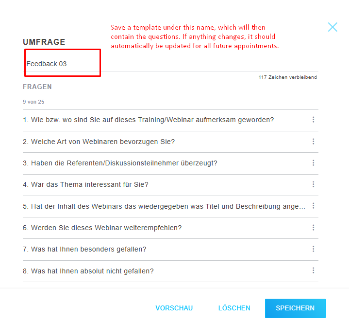 Is it possible to create a central template for feedback questions? This template could be stored behind the training/appointment. If the questions are changed or expanded, GoTo should automatically update all appointments using the template. This eliminates the need to manually edit each individual appointment. The copy function is not available after publication.